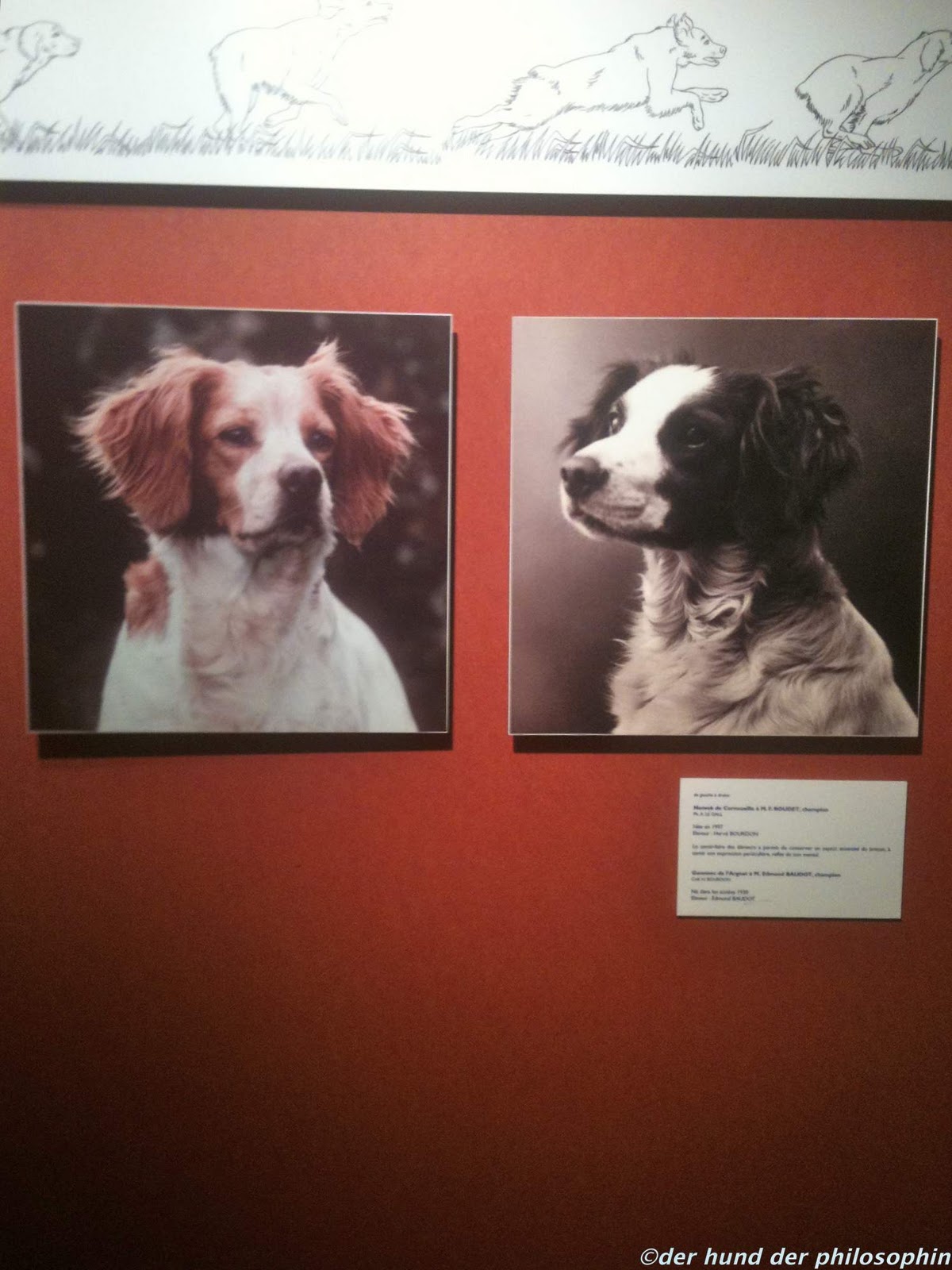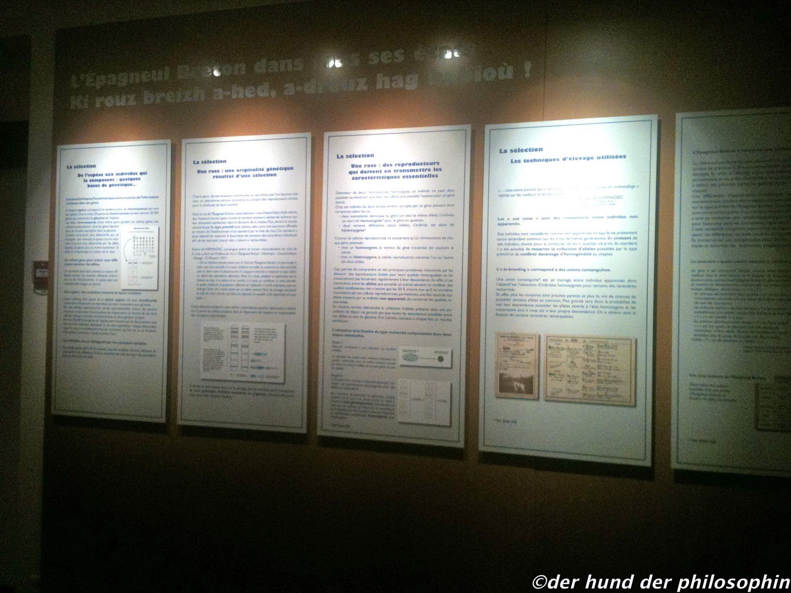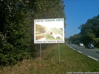 Gezüchtet wird in Frankreich in großen Zuchtanlagen, viele davon liegen um Callac, eine Stadt in der Mitte der Bretagne. Dort gibt es auch das „Maison de l’Epagneul Breton“, das Haus des Bretonischen Vorstehhundes, das eine kleine Ausstellung über die Rasse und ihre Geschichte zusammengestellt hat. Netterweise konnten wir uns diese auch außerhalb der Saison anschauen. Man kann sich über Züchter und Zuchtlinien informieren, über Aufzucht und Abrichtung der Jagdhunde, es gibt mehrere Filme, die komplizierte Farbvererbung wird erklärt, man kann seinen Geruchssinn mit dem eines Epagneul vergleichen und Schwarzweißfotos von Bretonen (diesmal meine ich die Menschen) im zwanzigsten Jahrhundert bewundern. Ein wirklich hübsches, empfehlenswertes Museum: