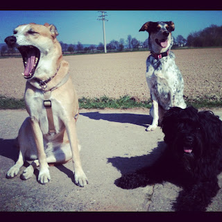 Dann haben wir verlassene Gärten besichtigt, einen Bewässerungsgraben gefunden als der Durst am Größten war, Habca und Nomi haben geuebt wie sich zwei Hunde auf kleinstem Raum so wälzen können dass beide den maximalen Duftgewinn haben, Mauri und Habca haben ein halbes Feld abgeweidet, wir haben uns von Joggern und Fahrradfahren und einem misanthropen Fußgänger bewundern lassen („Wenn die Menschen mal so gut hören würden!“). Und jetzt schlafen sie den Schlaf der Gerechten, die drei Rabauken… Platt, schmutzig, glücklich.