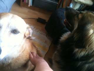 So sieht es aus wenn drei fürsorgliche Hunde einem mitteilen dass es Zeit für eine Kaffepause ist. Drei? Ja, Die dritte ist unterm Tisch.