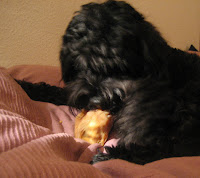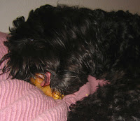 Deswegen war ich etwas besorgt, dass das Parmaschinken-mit-Knochen-Stück, dass ich bei Schecker gekauft habe, so groß und kompakt und hart ist. Aber da habe ich die Feinschmeckernase unterschätzt. Parmaschinken geht immer. Ganz ohne Bellen. Ruhige, konzentrierte Arbeit, Zähne auf Knochen, leises Schmatzen. Parmaschinken ist gut. Und nachher viel trinken. ;-)