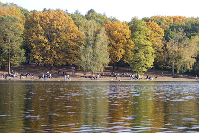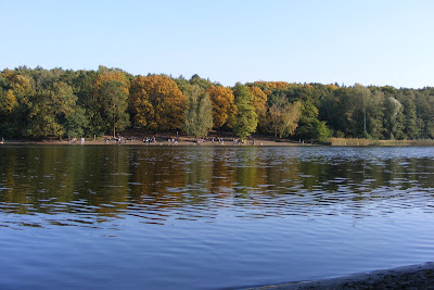 Am Samstag, Habcas Geburtstag, sind wir mittags in den Grunewald gefahren. Südlich der Avus ist alles Freilaufgebiet, ein Hundeparadies rund um die Seen, und wenn das Wetter schön ist, ist es richtig voll und es gibt viel zu sehen und zu erleben (Westberlin: Wer beim Durchblättern des neuen ALSA-Katalogs dachte: Die Stiefel sind schön, würde ich gerne mal in echt sehen – der ist hier auch richtig. ;-) )