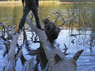 Typischer Grunewaldunfall: Der Stock treibt zu weit raus. Man müsste schwimmen. Also wirklich schwimmen, so mit nassem Scheitel und ohne Halt unter den Pfoten…