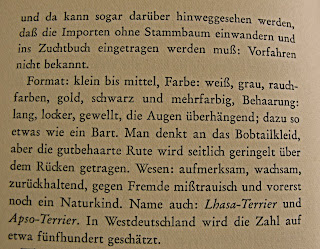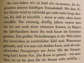 Diesen hübschen Japan-Chin habe ich kürzlich auf dem Flohmakt gefunden. Das Buch ist 1958 erschienen, aber größtenteils vor dem Zweiten Weltkrieg geschrieben worden. „Mit 39 Holzstichen englischer und deutscher Meister“ und Farbbildern zum Herausnehmen. Sehr bibliophil. Kurzweilig, wie der Titel verspricht, berichtet der Autor von in Deutschland bekannten Rassen und ihren Menschen. Er hat ein feines Auge für körperliche Besonderheiten, tiefsinnige Charakterstudien und die Individualität der Hunde. Seine Einschätzungen zu Häufigkeit und Zukunft der Rassen haben mich manchmal ganz schön überrascht. Dass beispielsweise der West Highland White Terrier einmal eine Seltenheit in Deutschland war, ist heute schwer vorstellbar, oder?