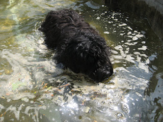 Es ist ziemlich schwierig, reinzuklettern, denn Habca springt nicht in unbekannte Gewässer (Baderegel Nummer 8). Letztlich, nach langem am Rand auf-und ablaufen und fiepen, habe ich sie reingehoben. (Das ist nicht so richtig toll, und mit einem Hund, der noch nie im Wasser war oder von dem ihr nicht sicher wisst, dass er Wasser mag und da jetzt gerne rein will, solltet ihr das nicht machen.)