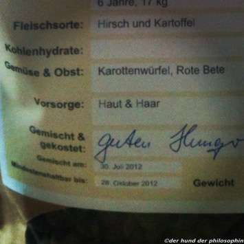 Die Lieferung ging wirklich schnell, und ähnlich hübsch wie die Website ist auch das Produkt gestaltet. Eine braune Papptüte mit Sichtfenster, eine handschriftliche Notiz, eine ausführliche Empfehlung eines Tierarztes, in die der Name meines Hundes an vielen Stellen eingesetzt wurde, was natürlich unheimlich persönlich wirkt.