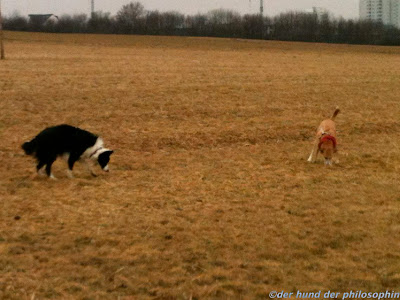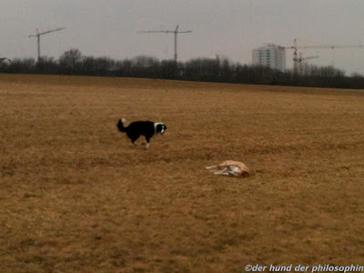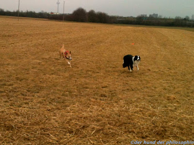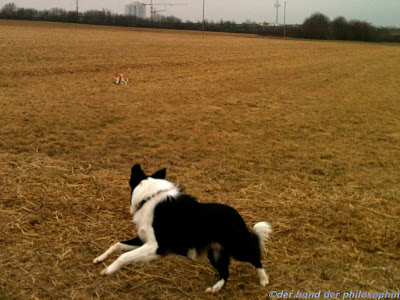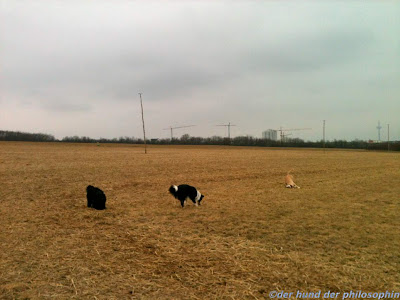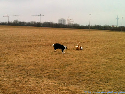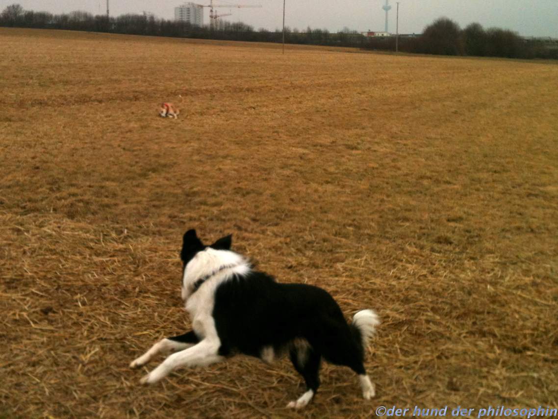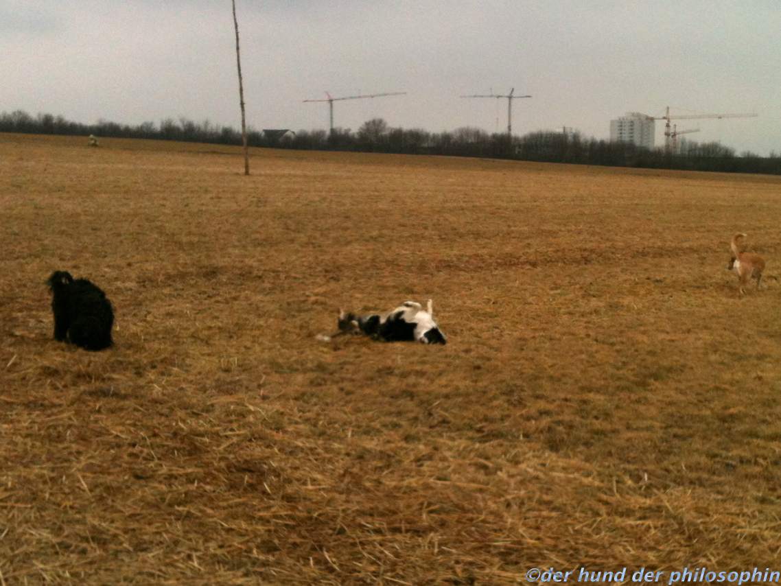 Schade nur dass ich keinen richtigen Fotoapparat dabei hatte. Und hey, so schlimm riechen die gar nicht. Habca und Nomi so ein bisschen würzig nach Pferd und Frühlingswind, und Border Collies haben offenbar Lotuseffekt-Fell.