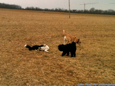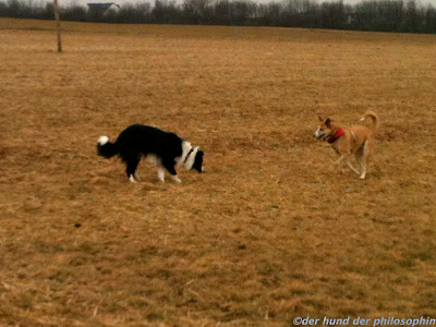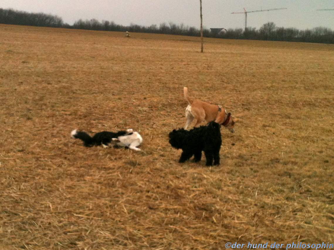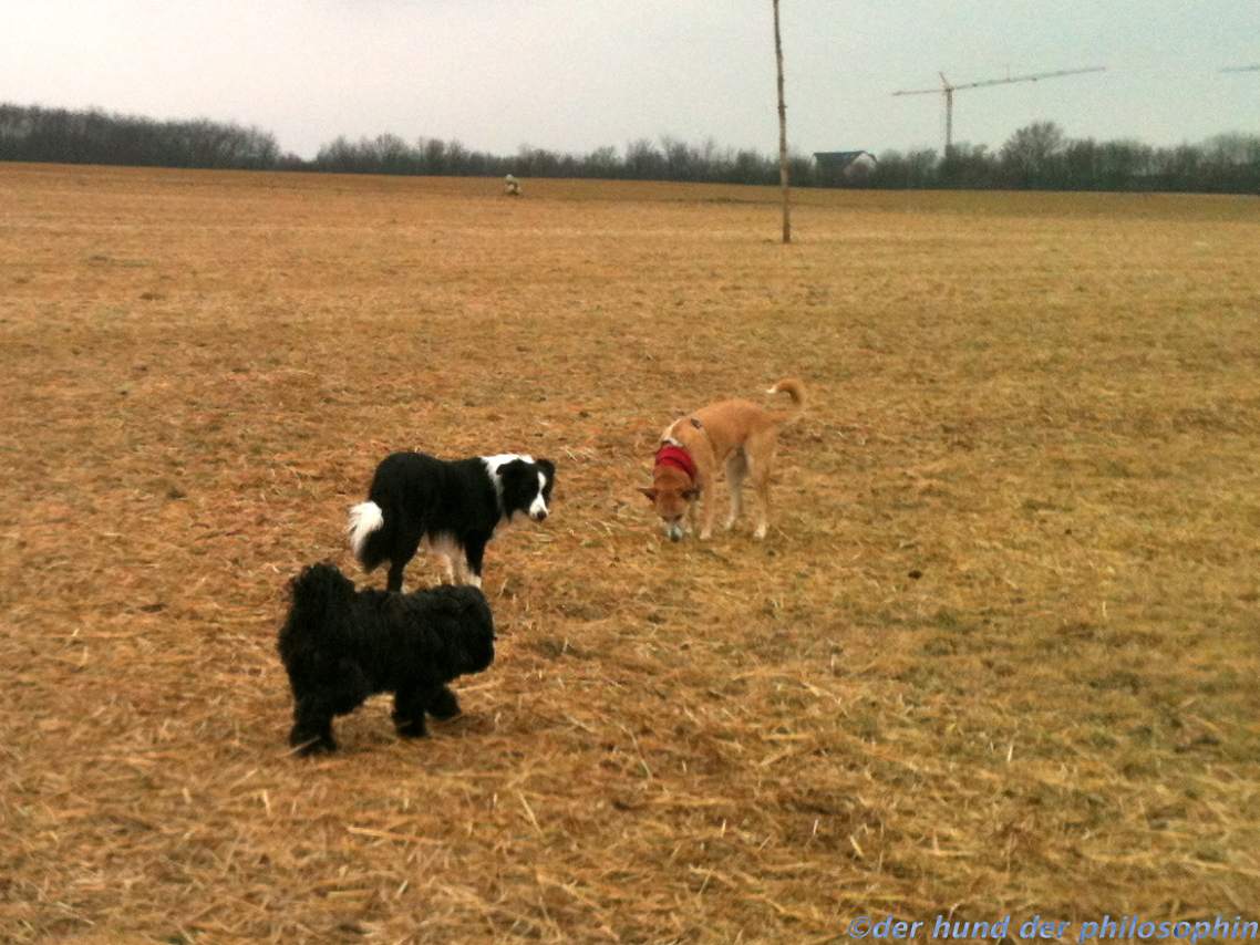 Heute hat uns Scotty auf dem Spaziergang begleitet. Nomi hat ja leider eine etwas ruppige Art andere Hunde zu begrüßen und ihnen die Hausstandsregeln darzulegen (von denen sie übrigens gerade eine neue Version entwirft die viel mit dem Zugang zu Essen und Orten potentiellen Fressens zu tun hat, wir diskutieren darüber noch).