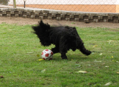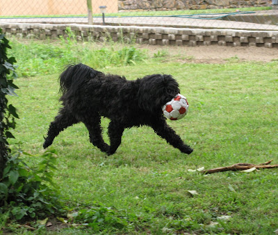 Natürlich hat Habca den Original-Schecker’s-WM-Ball mit allen Flaggen drauf. Und natürlich ist der mittlerweile etwas platt (es sind welpenzahnförmige Löcher drin?), so dass man ihn perfekt herumtragen kann. Aber nun, zur EM 2008, ist er in einer Umzugskiste verschollen, er ist nicht hier, und alle Hunde spielen doch Fußball…
