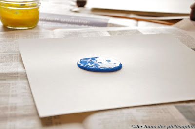 Dann tropft und kleckst man mutig auf ein Papier – je größer das Blatt desto lustiger, und 80g/m2 sollten es schon sein, sonst wellt es sich zu arg.