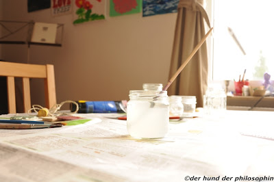 Man kann zwei Farben ineinanderlaufen lassen, oder mit Stempeln oder anderen Gegenständen Abdrücke machen.