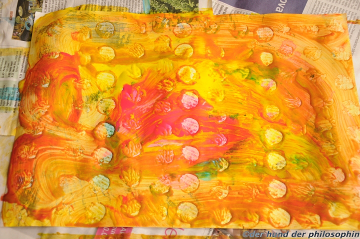Man kann zwei Farben ineinanderlaufen lassen, oder mit Stempeln oder anderen Gegenständen Abdrücke machen.
