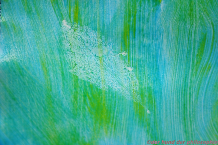 Dann tropft und kleckst man mutig auf ein Papier – je größer das Blatt desto lustiger, und 80g/m2 sollten es schon sein, sonst wellt es sich zu arg.