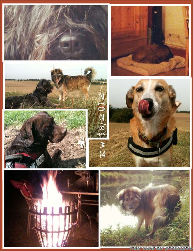 Diese Woche war unglaublich voll. Ich habe alle Termine hineingestopft die nur irgendwie passten – weil ich jetzt in Ferien fahre. Wir hatten viel Hundebesuch, Hunter hat zum ersten Mal hier geschlafen. Nomi (Mitte rechts) ging es erst ziemlich schlecht und dann viel besser – eine eigene Geschichte. Wir haben uns von Merlin (unten rechts) verabschiedet, der aus Frankfurt wegzieht. Professor (Mitte links) hat einen Baggersee entdeckt und Fredo (Mitte links oben) war mit beim Walking Lunch. Die Hundephilosophin macht große Pläne für Herbst und Winter. Die Grasmilben sterben ab. Der Löwenzahn im Garten blüht. Ganz viele neue Teams starten ins Mantrailing. Ich hatte einige schwierige, belastende Gespräche und staune wieder was Hundetrainerkollegen alles tun, und wieviel Hundebesitzer da ertragen, erdulden und ihren Hunden antun lassen. Gut meinend. Ich freue mich auf die Ferien. Ich brauche Ferien. Ich hoffe es geht alles einen guten Gang hier, während ich weg bin.