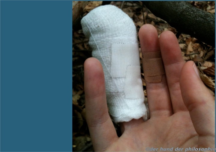 Da ich überzeugt war dass der Finger gebrochen sein muss – mir war schon ganz schlecht vor Schmerzen – haben wir den Rest des Tages in der Notaufnahme respektive im Auto davor (der Hund) verbracht…
