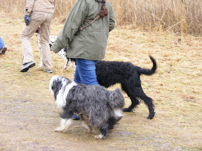 Unsere erste Hunderunde war ein voller Erfolg: Kein Regen, lauter nette Hunde und Menschen, Spielkameraden für jeden, genug Schlamm und Pfützen und Begegnungen mit anderen Hunden.