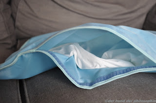 Jetzt kommt das kühle Innenkissen in die Polyesterhülle, die wird mit einem Klettverschluss zugemacht.