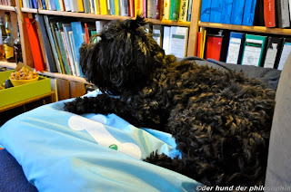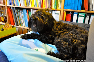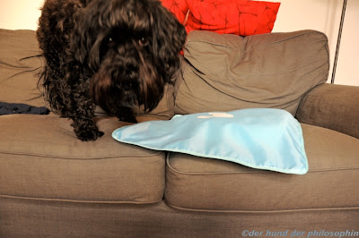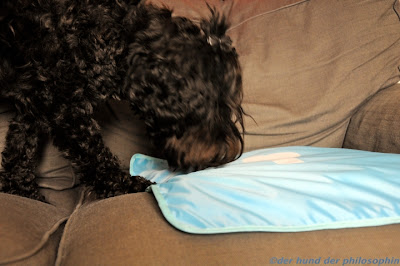Letztlich haben wir einen Kompromiss geschlossen und ich habe das Kissen unter eine von ihren Decken gelegt. Auf dem Sofa lag sie trotzdem meistens daneben, hat aber gern ihren Kopf auf das kühle Kissen gelegt. An ganz heißen Tagen habe ich es mir ausgeliehen, als eine Art Anti-Wärmeflasche, und fand es total angenehm. Und wenn Habca wieder mal ankam mit „Frauchen es ist sooo heiß kann ich auf Dir liegen und kuscheln?“ dann haben wir es auch mal andersrum geschichtet: Unten das schwitzende Frauchen, dadrauf der glühende Hund, dadrauf das kühle Kissen. Das fand der Hund total gut. ;-)