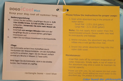 Übrigens habe ich mich für eine Kühlmatte entschieden und nicht für ein Kühlhalsband oder einen Kühlmantel, weil ich bei allen solchen Anwendungen finde der Hund sollte die Möglichkeit haben sich dem zu entziehen wenn es ihm unangenehm ist oder er einfach genug hat.