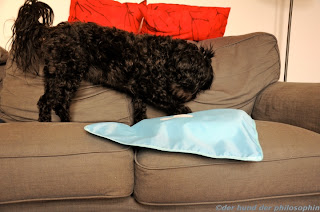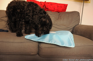 „Das riecht nicht nach mir und nicht nach Nomi, ist schon mal nicht gut. Es ist nicht so weich wie meine Fleecedecken. Und wenn man seine Pfote drauf setzt WABBELT das!“