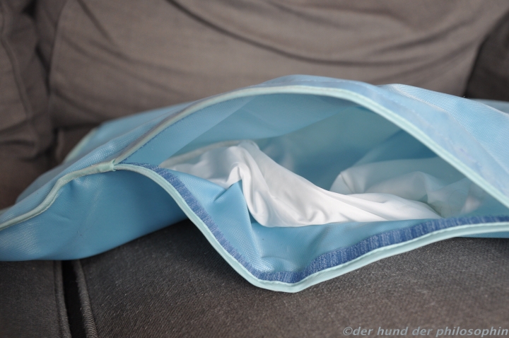 Unter einer Decke ist das Kissen natürlich nicht mehr ganz so kühl wie solo, aber ein klarer Kühlungseffekt lässt sich noch fühlen. Und es reicht ja ein dünnes Baumwolltuch. Unempfindlichere Hunde als meine Prinzessin legen sich bestimmt auch auf das Polyester. Fühlt sich ein bisschen an wie eine Kühltasche… Überhaupt ist das Kissen nicht eiskalt, nicht wie diese blauen Kältekompressen aus dem Tiefkühlfach! Das ist vernünftig, der Hund soll ja keine Erfrierungen kriegen.