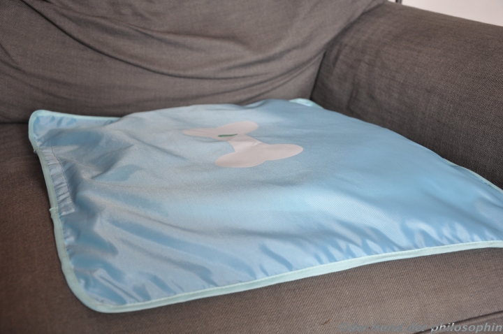 Jetzt kommt das kühle Innenkissen in die Polyesterhülle, die wird mit einem Klettverschluss zugemacht.