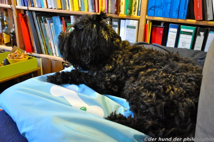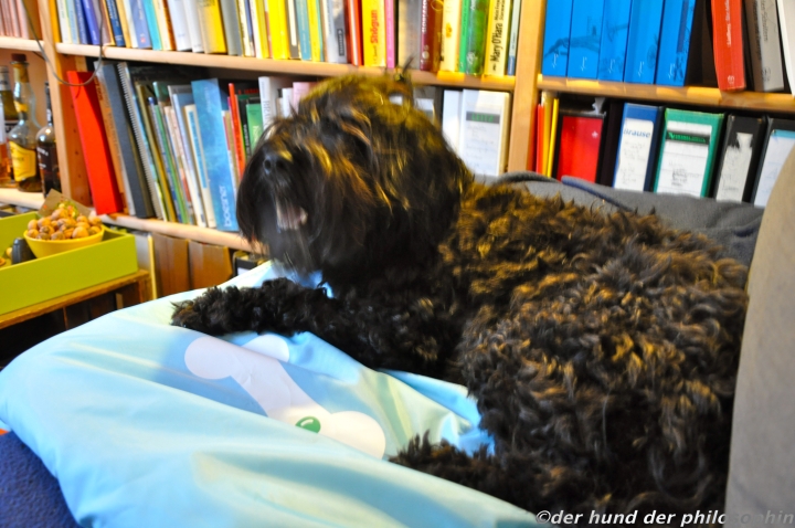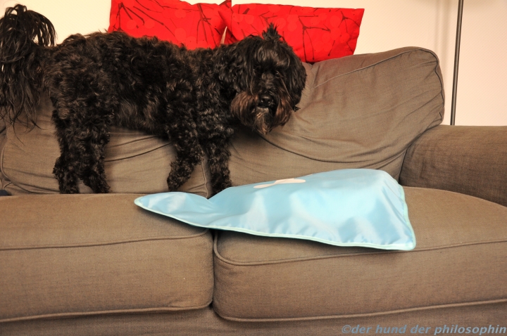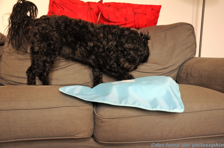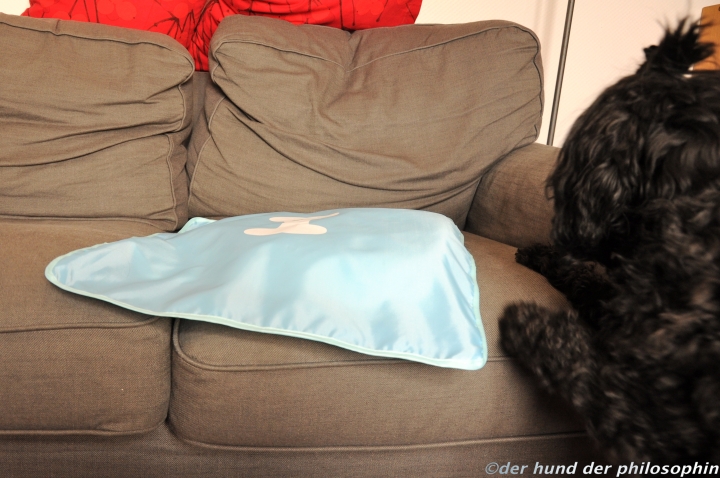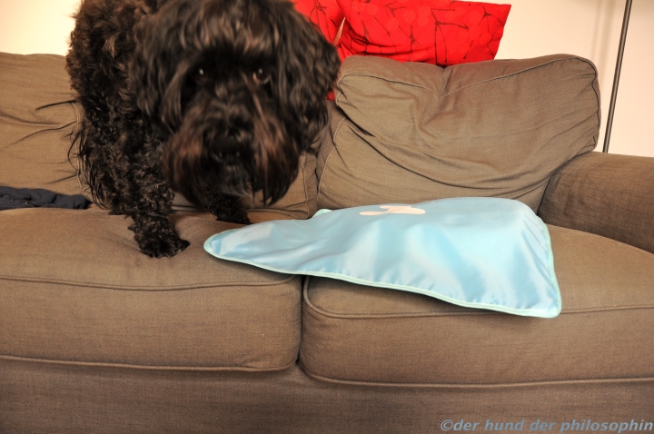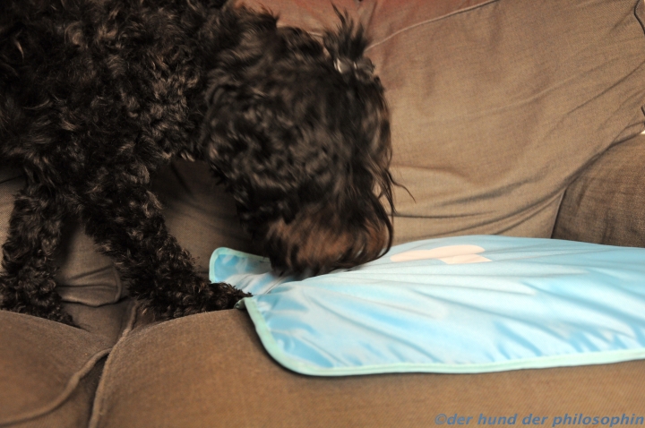 Letztlich haben wir einen Kompromiss geschlossen und ich habe das Kissen unter eine von ihren Decken gelegt. Auf dem Sofa lag sie trotzdem meistens daneben, hat aber gern ihren Kopf auf das kühle Kissen gelegt. An ganz heißen Tagen habe ich es mir ausgeliehen, als eine Art Anti-Wärmeflasche, und fand es total angenehm. Und wenn Habca wieder mal ankam mit „Frauchen es ist sooo heiß kann ich auf Dir liegen und kuscheln?“ dann haben wir es auch mal andersrum geschichtet: Unten das schwitzende Frauchen, dadrauf der glühende Hund, dadrauf das kühle Kissen. Das fand der Hund total gut. ;-)