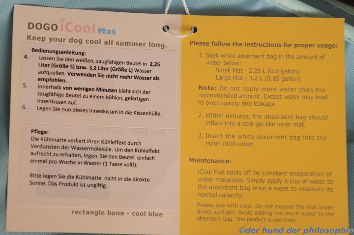 Übrigens habe ich mich für eine Kühlmatte entschieden und nicht für ein Kühlhalsband oder einen Kühlmantel, weil ich bei allen solchen Anwendungen finde der Hund sollte die Möglichkeit haben sich dem zu entziehen wenn es ihm unangenehm ist oder er einfach genug hat.