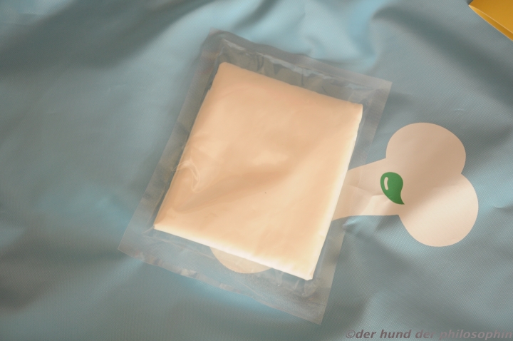 Den weißen, saugfähigen Beutel lässt man in 3,2 Liter Wasser (für die matte Größe L). Wie versprochen bläht sich der Beutel im Wasser auf wie eine Luftmatratze. Das Ergebnis ist ein gelartiges Innenkissen das sich tatsächlich kalt anfühlt. Ein bisschen feucht kommt es mir schon vor – vielleicht hätte ich noch länger warten sollen damit auch die Restfeuchtigkeit noch aufgesogen wird?