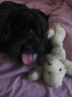 Habca, Bert-der-Bär und ich haben verstecken gespielt. Habca musste vor der Tür warten, und ich habe Bert-dem-Bär geholfen, ein gutes Versteck zu finden. Aber Habca ist immer zielgerichtet zu ihm gelaufen, wenn ich sie reingerufen habe. Obwohl manche Verstecke ganz schön schwer waren.