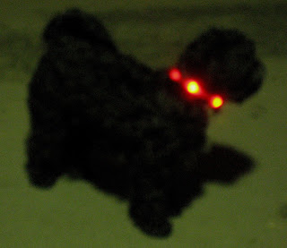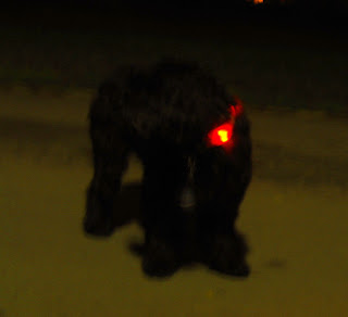 Oft ist es derzeit beim Spaziergehen schon dunkel, und „Hundebeleuchtung“ ist ein ergiebiges Thema. Billige Leuchthalsbänder fallen beim Spielen ab, bei anderen Modellen halten die Batterien nicht lange, die Bänder gehen kaputt, verloren, sind nicht wasserfest, oder stören den Hund. Eine Freundin hat ein kleines Fahrradlicht am Halsband befestigt, das scheint ganz gut zu funktionieren. Wir haben jetzt ein Leuchthalsband gefunden, an dem – bis jetzt – nichts auszusetzen ist: Das Leuchtie. Sowas kommt natürlich aus Amerika. Es hat keinen Verschluss, so dass es nicht aufgehen kann, sondern wird einfach über den Kopf gezogen.
