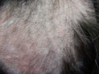 An der Ohrenspitze sind die Haare noch da, und oben am Ohr auch. Frauchen findet komisch, dass die Haut überhaupt nicht gereizt aussieht, nicht rot ist, und es juckt auch nicht.