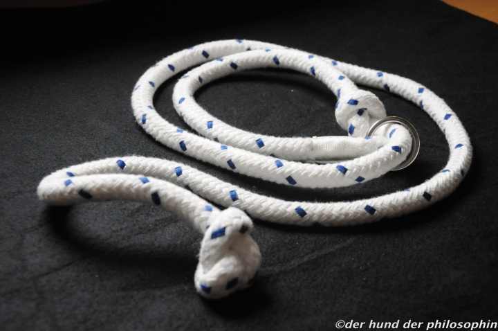 Ich benutze sie nur dann wenn ich wirklich sicher bin dass es keinen Grund zum Ziehen geben wird. Ein Hund der zieht sollte am Geschirr geführt werden, oder an einem breiten, gepolsterten Halsband mit Verschluss. – Deshalb ist das unsere Ferienleine, oder unsere „Gegen-23h-nochmal-schnell-Pipi-machen-Leine“. Offiziell heißt sie „de kleene Butjer met Knuff„.