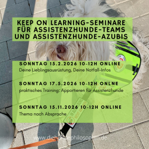 Das Thema dieses mal: Apportieren für Assistenzhunde. Wir trainieren gemeinsam online – bitte Kamera entsprechend aufbauen, Apportiergegenstände, Hund und Belohnung bereithalten. Jede*r kann auf seinem/ ihren Stand trainieren und wir profitieren voneinander.